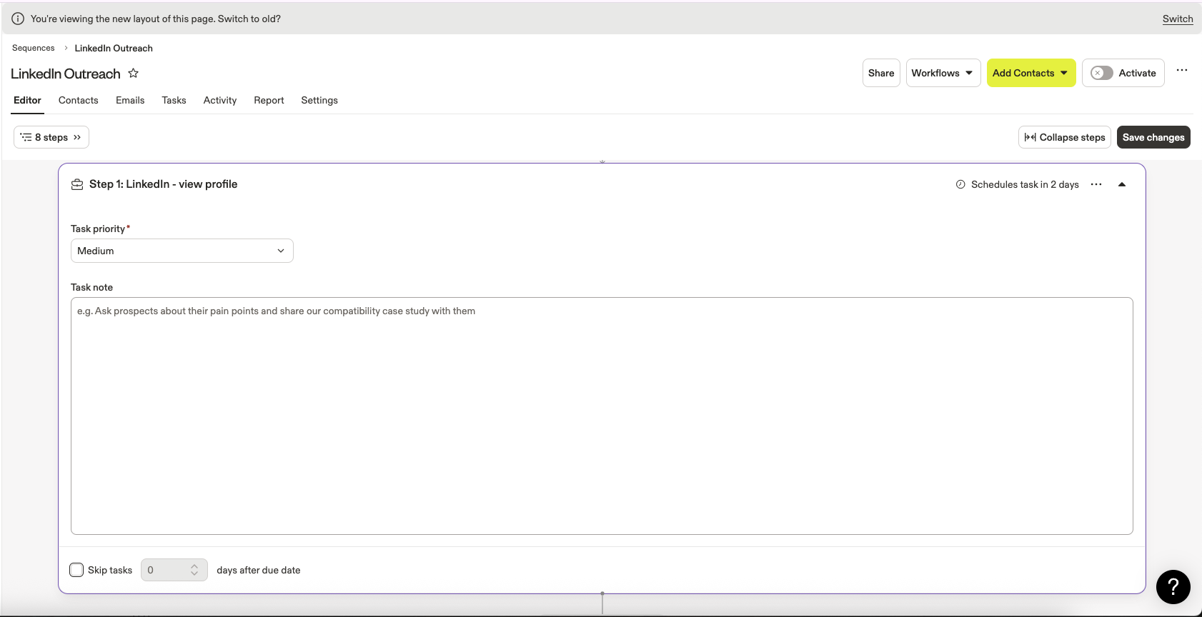 The updated layout shows all sequence steps in one view, with easy access to Skip Step settings.